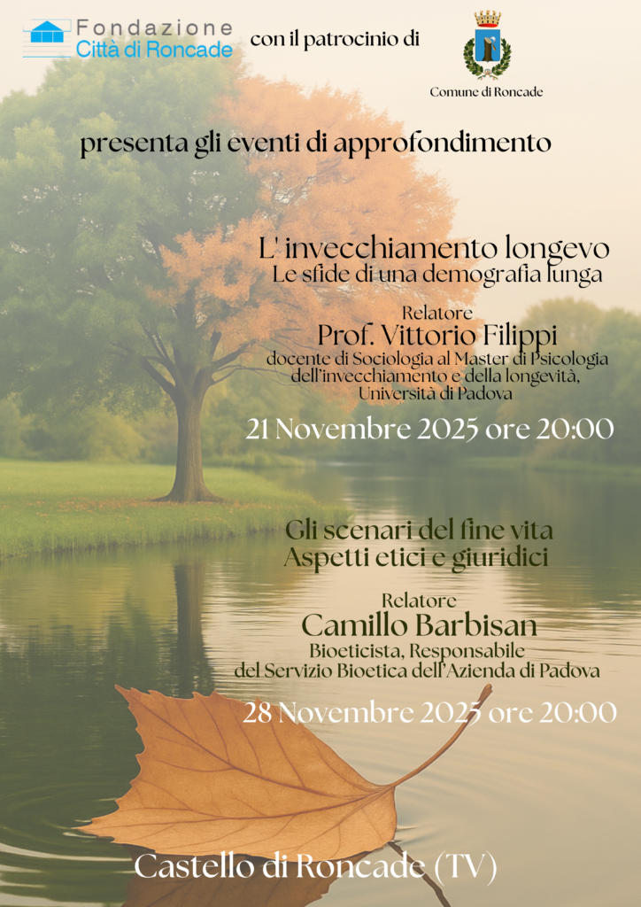 Fondazione Città di Roncade annuncia due eventi di approfondimento dedicati a temi che toccano ogni persona, ogni famiglia e ogni comunità: l’invecchiamento longevo e gli scenari etici e giuridici del fine vita.
